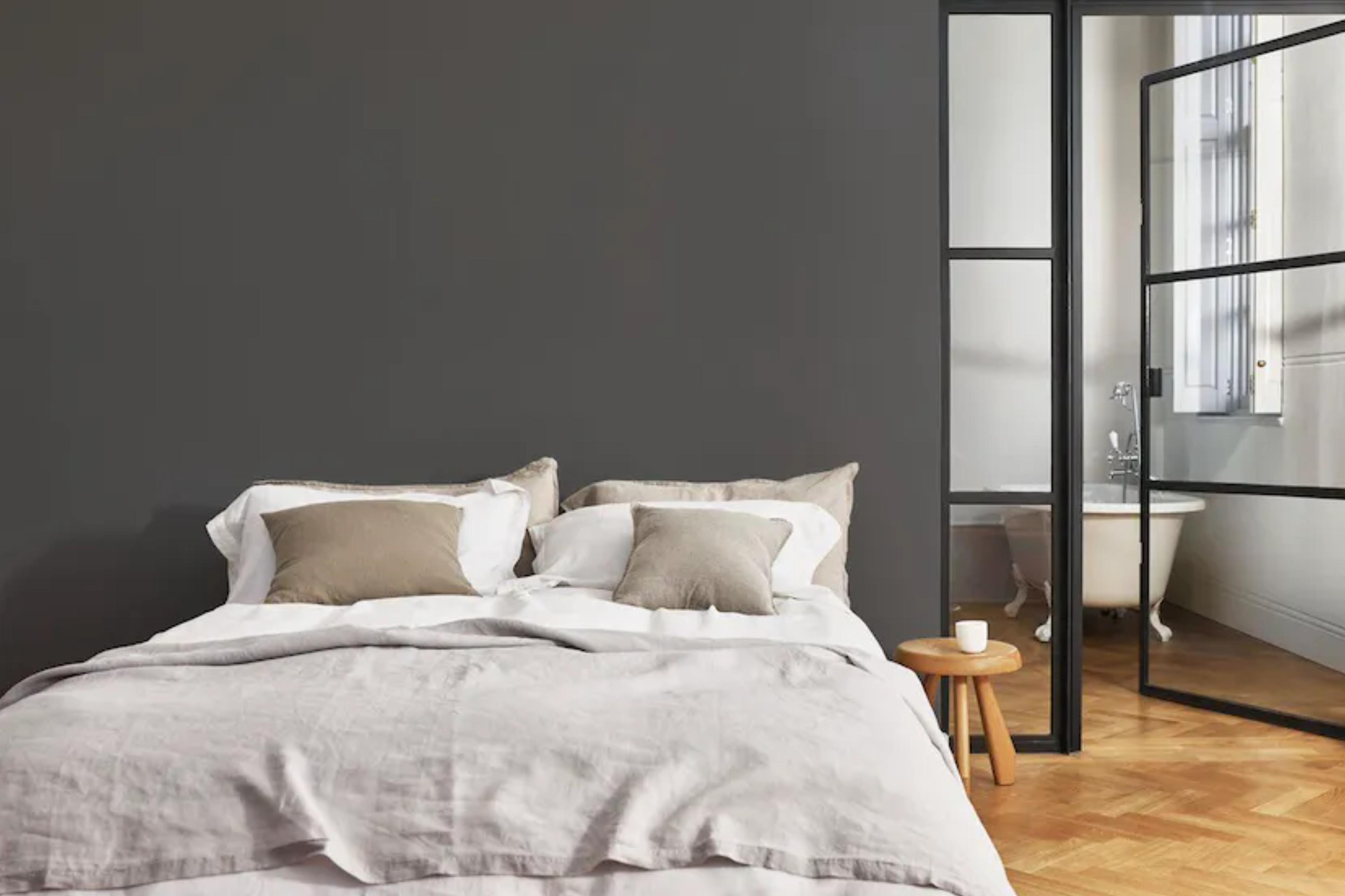 Wir haben bereits Grautöne mit einem Hauch von Grün gesehen. Denim Drift von Flexa hat hingegen eine bläulichere Unternote. Wir finden diese Farbe wirklich herrlich, vor allem in Kombination mit frischen weißen Fensterrahmen, weißer Wand und dem Bettbezug im Schlafzimmer.